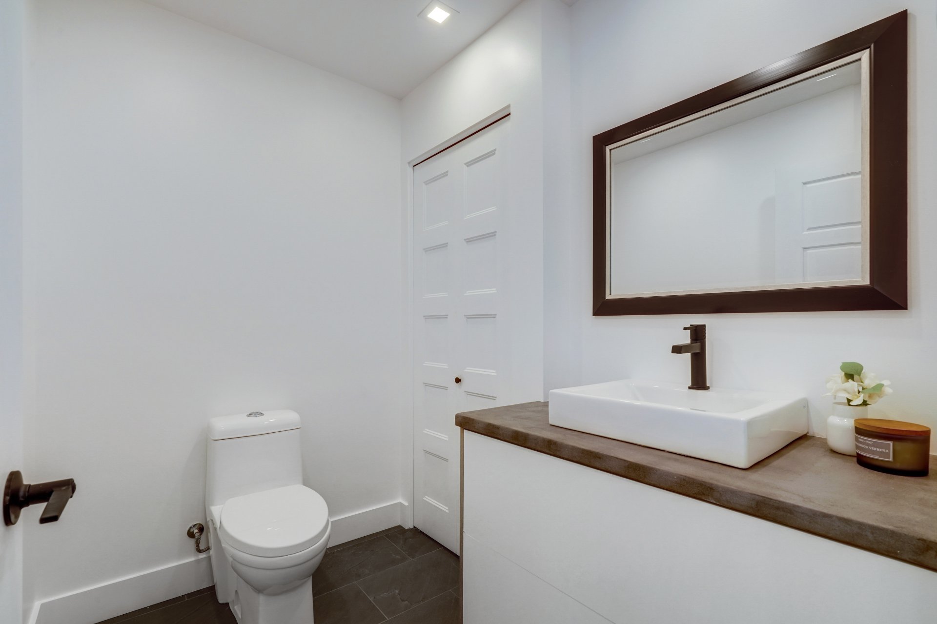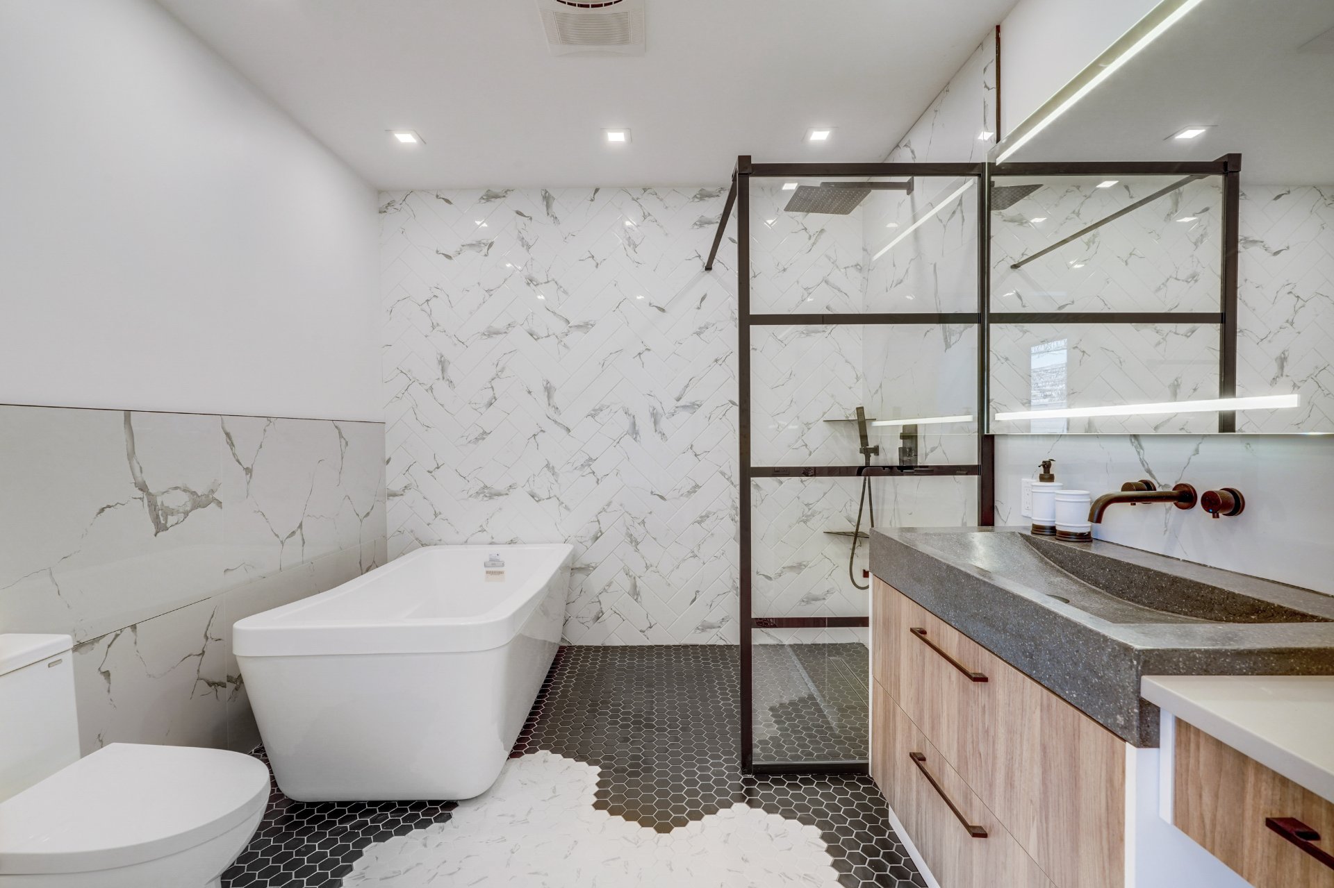 Interventions clés : poutre d’acier sur deux niveaux pour ouvrir les planchers, escalier à limon central qui maximise la lumière naturelle, ajout d’un mudroom, d’une suite des maîtres avec salle de bain et walk-in, et d’une terrasse avec vue sur le stade olympique.